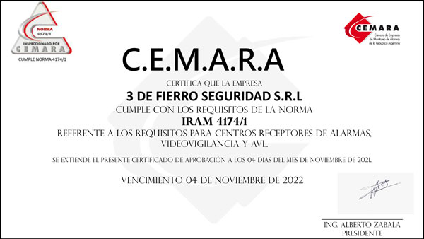 La Cámara de Empresas de Monitoreo de Alarmas de la República Argentina certificó el cumplimiento de Normas IRAM en nuestros servicios.